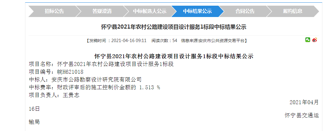 公司中標(biāo)懷寧縣2021年農(nóng)村公路建設(shè)項目設(shè)計服務(wù)1標(biāo)段