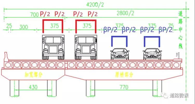 1.按車輛類型在拼寬橋梁施行分車道交通組織管理,降低拼寬橋中既有橋梁的荷載效應(yīng)。既有橋梁部分主要承擔(dān)輕型車荷載,新建橋梁部分主要承擔(dān)重型車荷載。